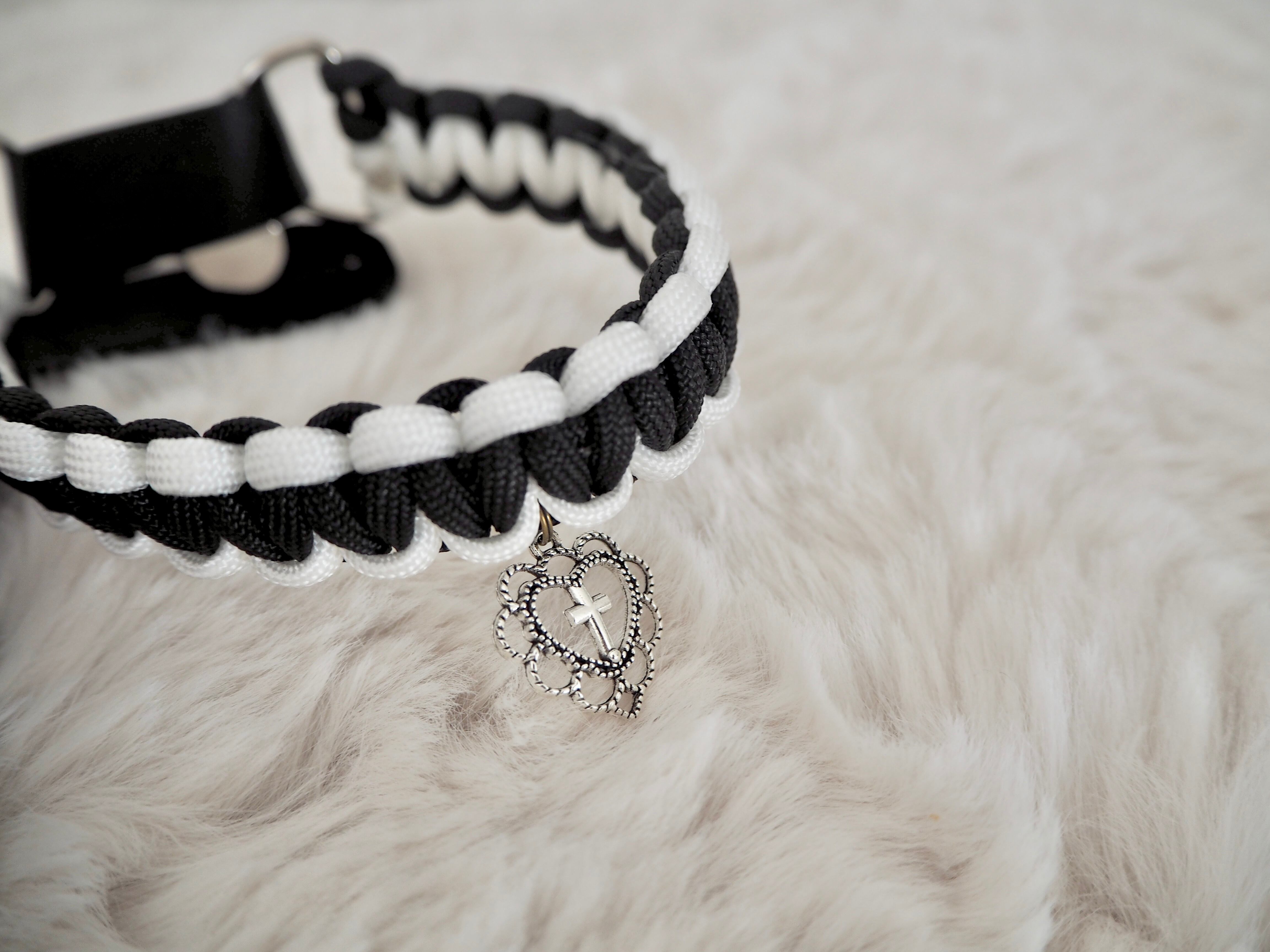 ハーフチョークのようにリボンで長さを調節できる首輪です