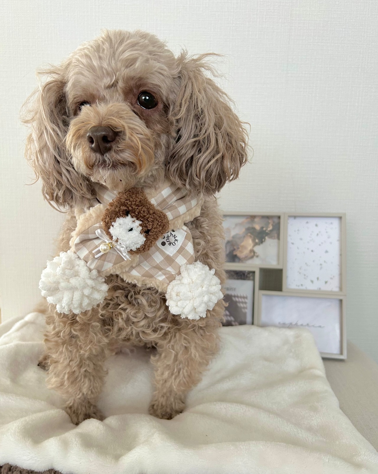 くまちゃんがついたギンガムチェック柄のマフラー
